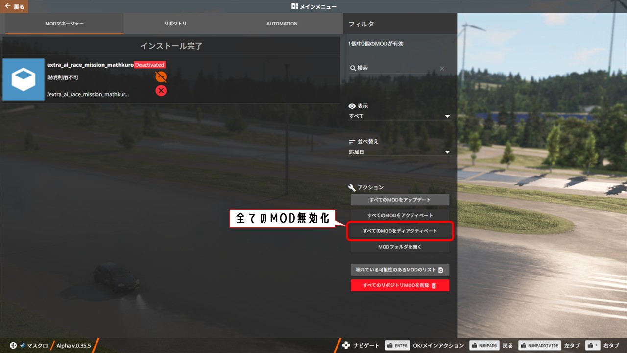 これで解決した場合は、無効化したMODのどれかが原因なので、一つずつ有効化して原因のMODを特定しましょう。原因のMODが特定出来たらそのMOD以外は全て有効化に戻してOKです。*2