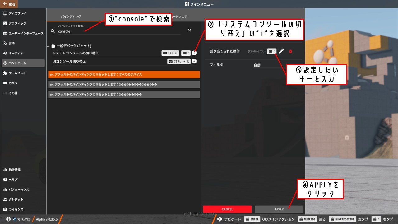 このページではBeamNG.driveに搭載されているシステムコンソールの使い方を紹介する。