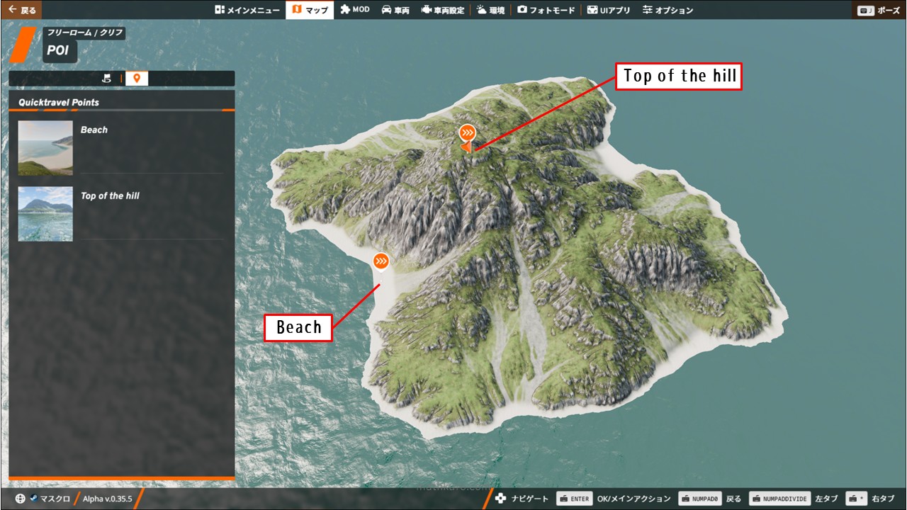 海に面した急勾配な岩が周囲を囲う島状のマップです。頂上で車の落下試験を行い、ビーチにスポーンした自慢のオフロードマシンで山頂までの岩山クローリングに挑戦しましょう。