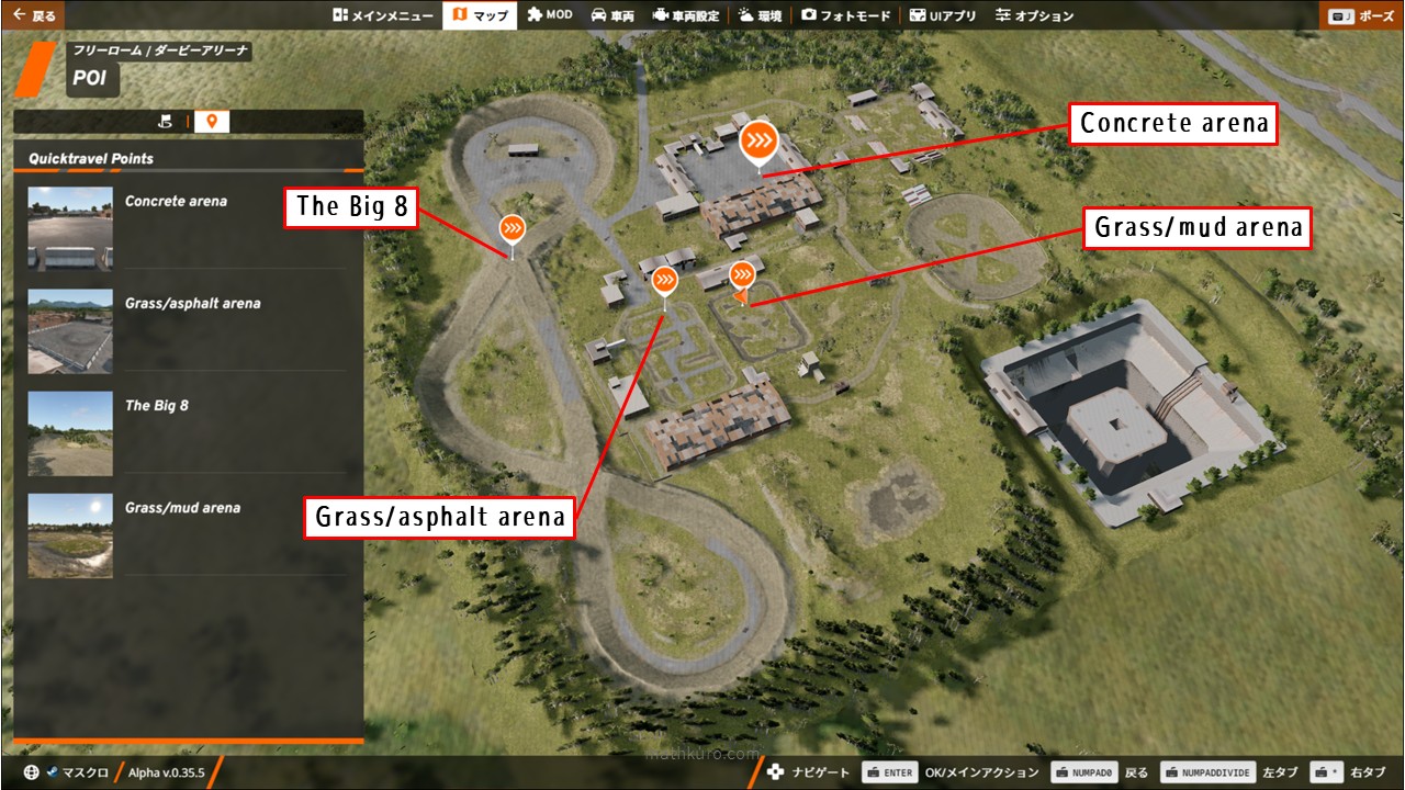 | Grass/asphalt arena | デフォルトスポーン地点、草原/アスファルト舗装のダービーアリーナ。 |
