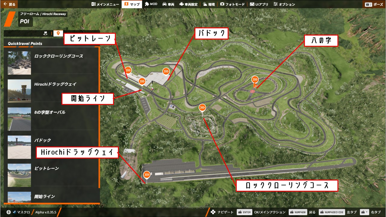 ヒロチ・レースウェイは、レーストラックやその他のモータースポーツ施設を備えたアメリカ合衆国メイン州のマップです。日本の自動車メーカー「ヒロチ」の名を冠した、アスファルトサーキットのレイアウトは、元々ホンダのテストトラックだった鈴鹿サーキット(逆さ)から着想を得ているようです。