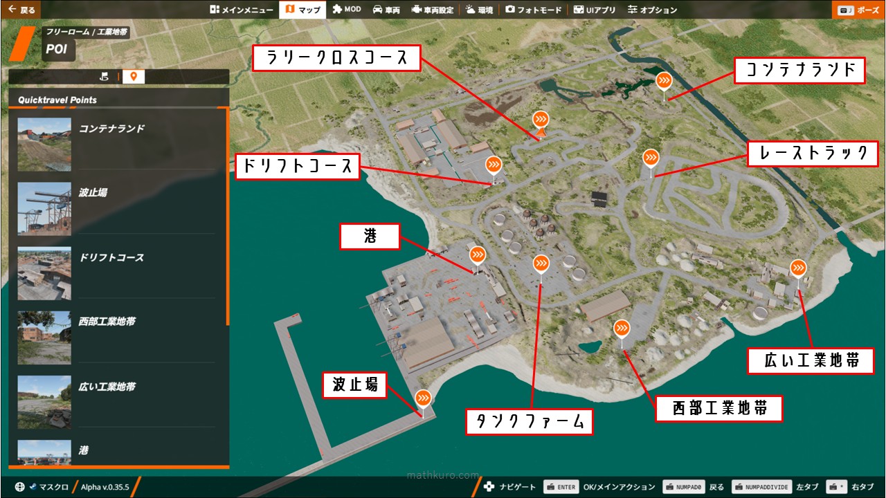 “Industrial Site”(工業地帯)は、テキサス州の廃墟となった工業地帯をモチーフとしたBeamNG.driveマップです。このマップは沿岸地域で、造船所・複数のレーストラック・ロッククローリングコースも含まれています。