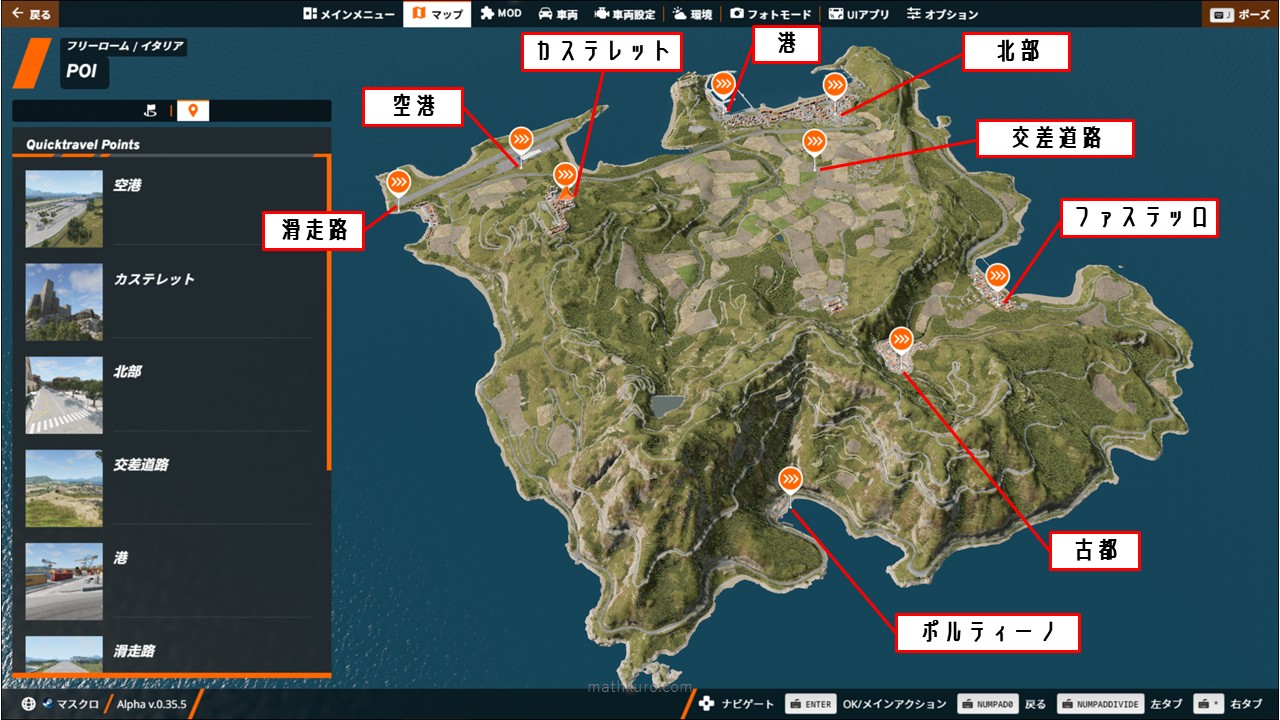 イタリアはBeamNG.drive最大のマップです。2018年後半にバージョン0.15で、アウトベッロ・ピコリーナと共に追加されました。その後も継続的に改良が続けられており、特にバージョン0.16(ポルティーノ市の追加、要塞、港、空港の改良、ガソリンスタンドの増設など)、バージョン0.22(ガレージ4軒とディーラー3軒の追加)、バージョン0.26(PBRによる道路と植生テクスチャの更新、その他の改良)、バージョン0.34(バス停の新デザイン)、バージョン0.35(フリーロームドリフトゾーン4ヶ所)がリリースされました。