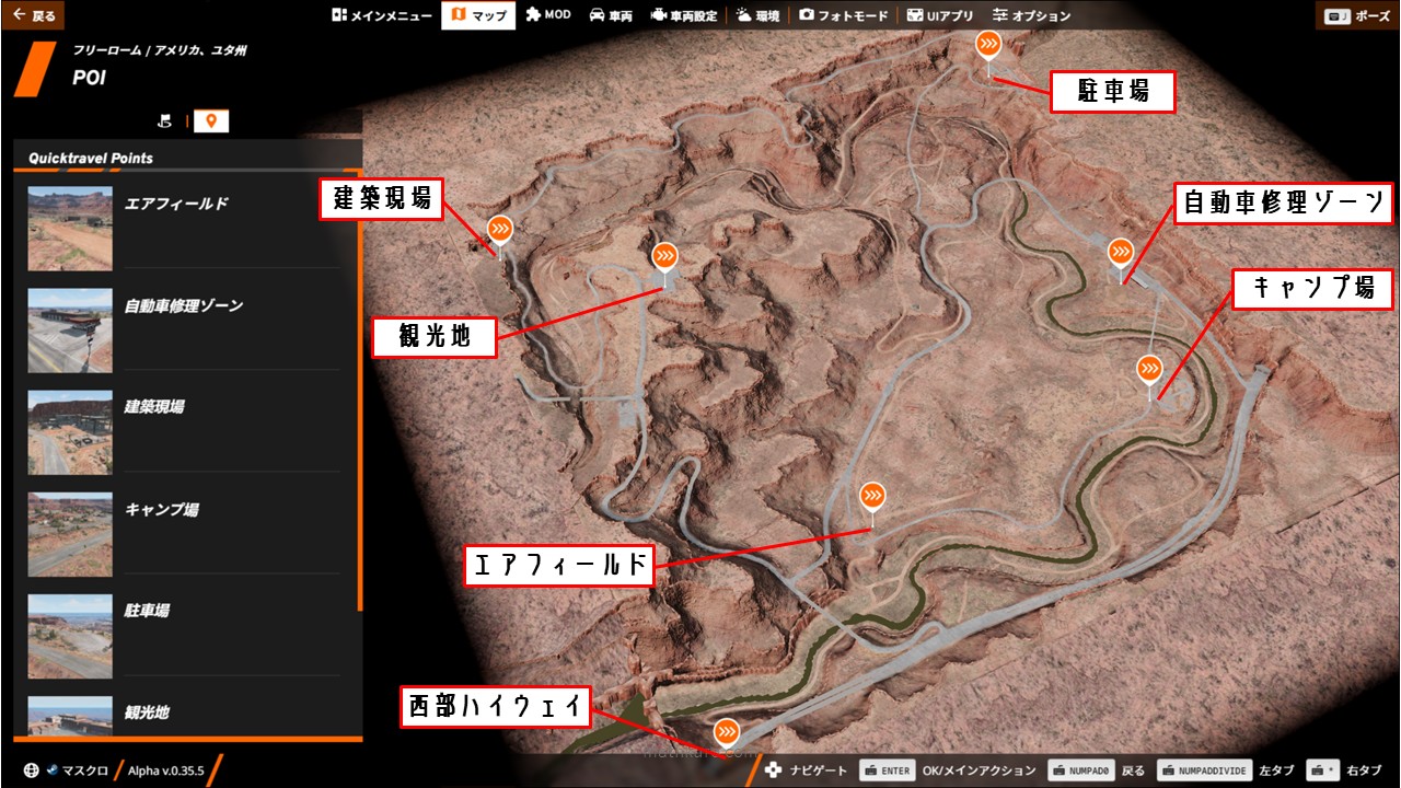 「アメリカ、ユタ州」マップは、ユタ州南部、より正確には架空のウェストロックキャニオン国立公園内の砂漠の峡谷周辺に位置しています。街はありませんが、建物や商店がいくつかあり、高速道路、アスファルトが剥がれた道路、川、そしてたくさんのトレイルがあります。